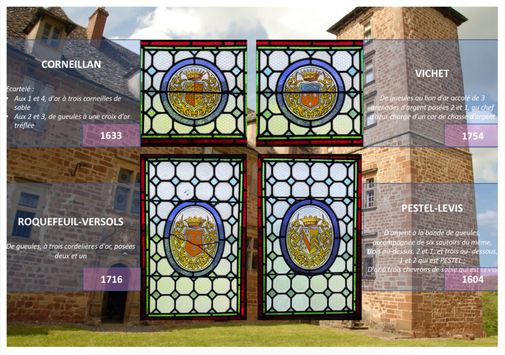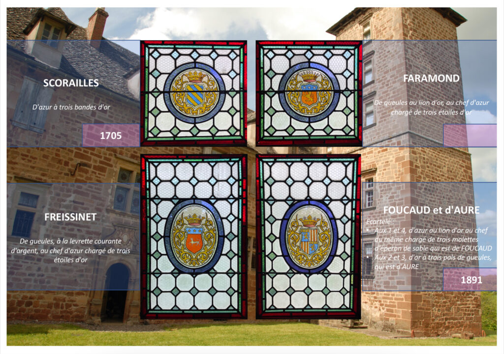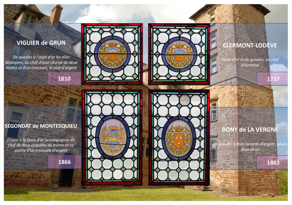 En 1892 il confie au peintre verrier ruthénois Laurent Théotime Lachaize le soin de réaliser les vitraux pour les croisées du Grand Escalier. Il expose ce faisant les alliances illustres de leurs deux familles parmi lesquelles celles avec les Scorailles Roussille et les Sécondat de Montesquieu. Les dates correspondent aux années des alliances.